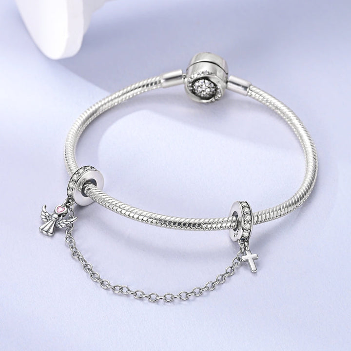 Los clips son accesorios diseñados para distribuir equitativamente los charms en una pulsera, manteniendo un equilibrio visual y funcional. Por su parte, las cadenas de seguridad evitan que los charms se caigan si la pulsera llega a abrirse accidentalmente.