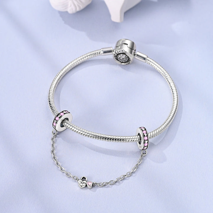 Los clips son accesorios diseñados para distribuir equitativamente los charms en una pulsera, manteniendo un equilibrio visual y funcional. Por su parte, las cadenas de seguridad evitan que los charms se caigan si la pulsera llega a abrirse accidentalmente.
