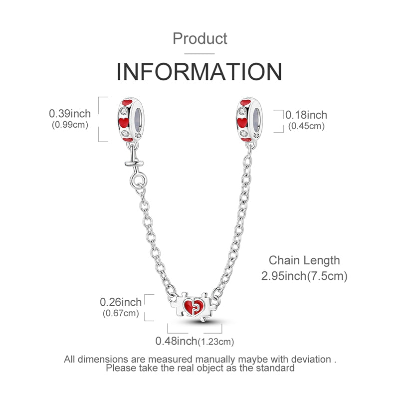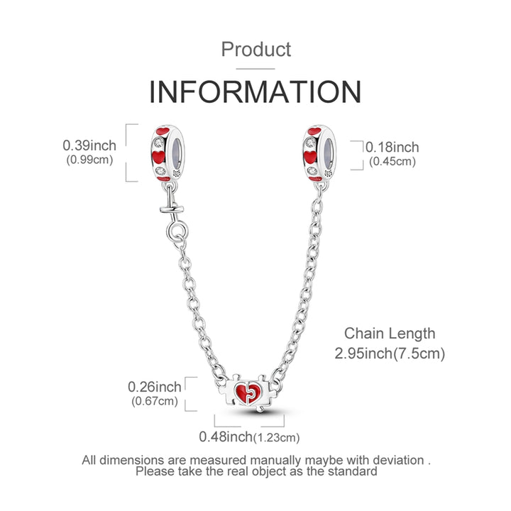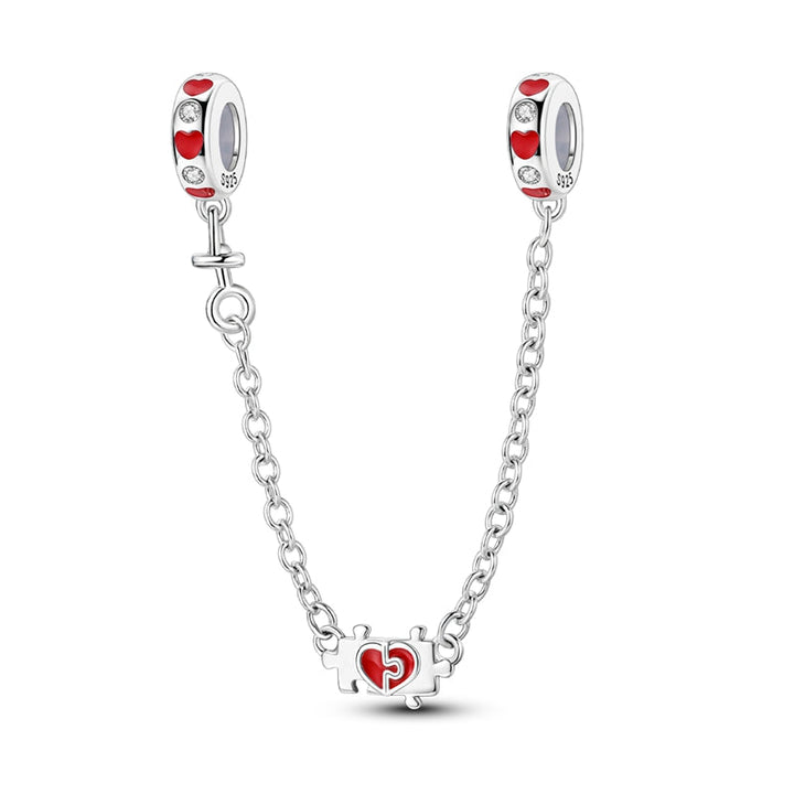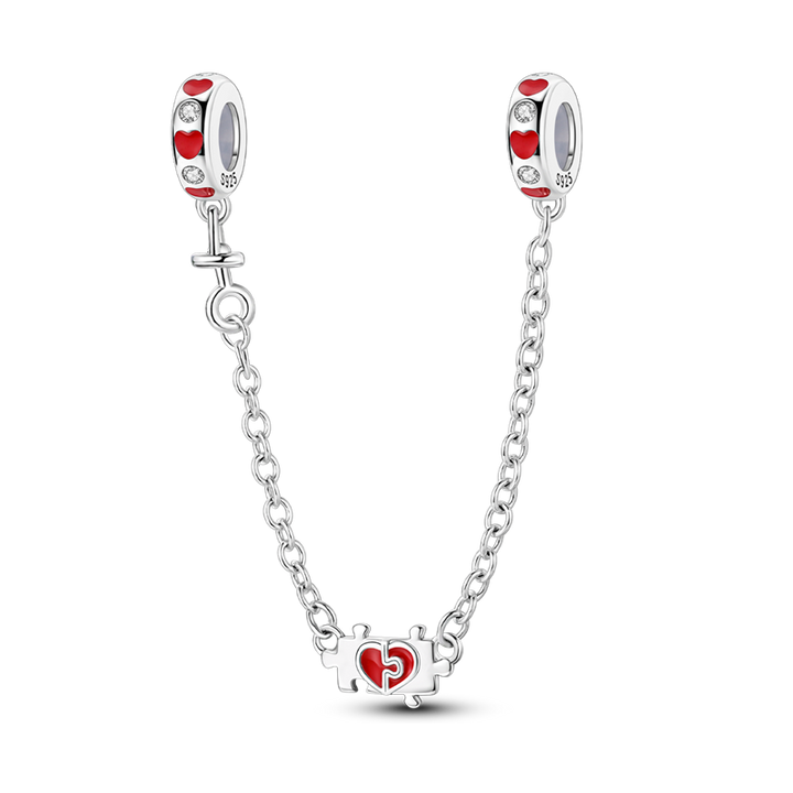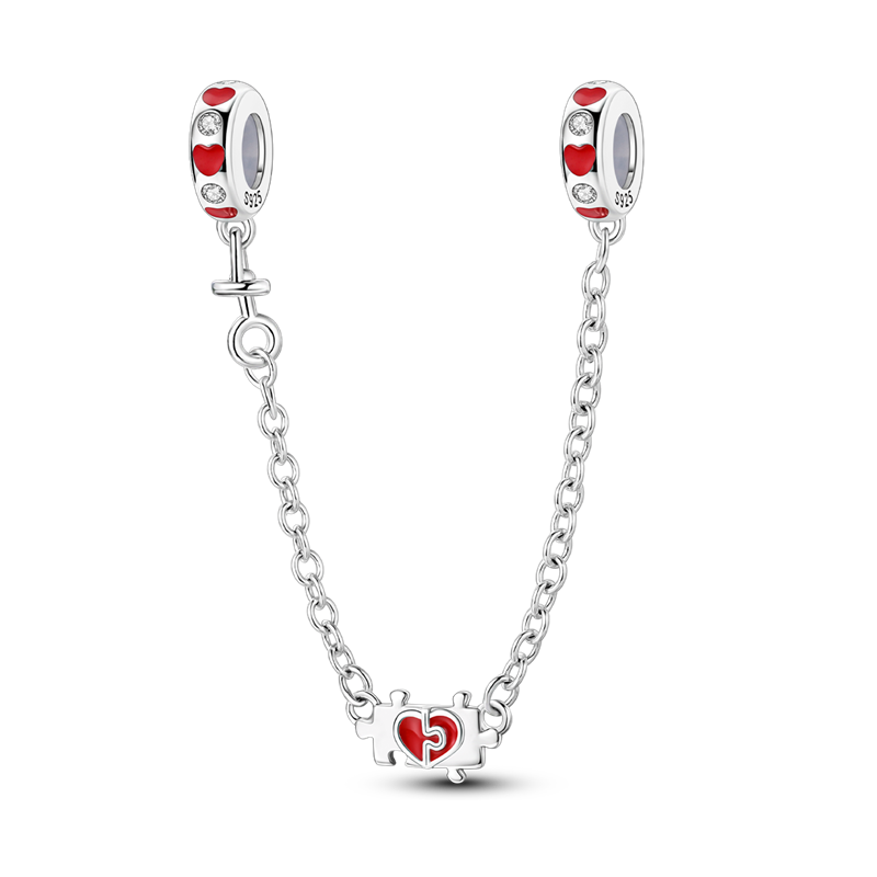 Esta encantadora cadena de seguridad presenta un diseño en forma de corazón dividido en dos piezas de rompecabezas, cada una decorada con detalles en plata y pequeñas incrustaciones de circonia para un brillo elegante. Las piezas encajan perfectamente, simbolizando la conexión especial entre dos personas. Ideal para mantener los charms seguros en una pulsera, esta cadena representa la unión y el amor, haciendo de ella un accesorio lleno de significado.