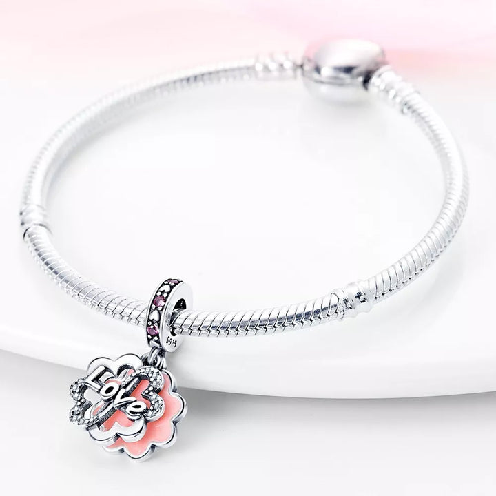 Con cada pétalo radiante y cada curva elegante, este encanto irradia amor y afecto en cada detalle. La flor, símbolo de crecimiento y renovación, representa el florecimiento del amor en todas sus formas y colores. El corazón del encanto, inscrito con la palabra "Love", es un recordatorio constante del poder transformador del amor en nuestras vidas.