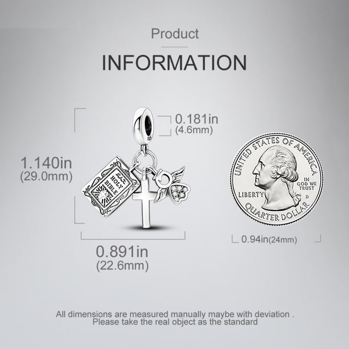 Cada detalle meticulosamente grabado en este encanto evoca la sagrada sabiduría de la Santa Biblia, mientras que el angelito representa la presencia de los mensajeros divinos que nos rodean con amor y protección. Juntos, forman un conjunto que inspira confianza y fortaleza en la fe.