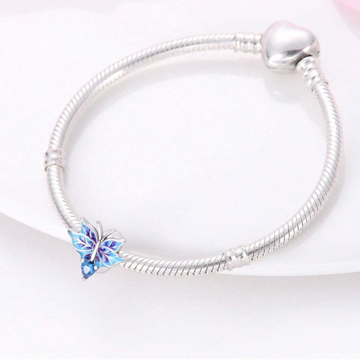 El "Charm Mariposa Azul" es una pieza exquisita que captura la belleza y la elegancia de las mariposas. Esta encantadora joya presenta la forma delicada de una mariposa, cuidadosamente elaborada para resaltar cada detalle de sus alas extendidas.