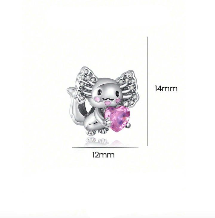 Ideal para aquellos que sienten una conexión especial con la naturaleza, el "Ajolote y Corazón Rosa" celebra la belleza de las criaturas únicas. El ajolote, conocido por su capacidad de regeneración y su aspecto peculiar, simboliza la resiliencia y la adaptación, mientras que el corazón rosa aporta un toque de amor y afecto. Este charm es un recordatorio constante de la importancia de adaptarse con amor y perseverancia en la vida cotidiana.