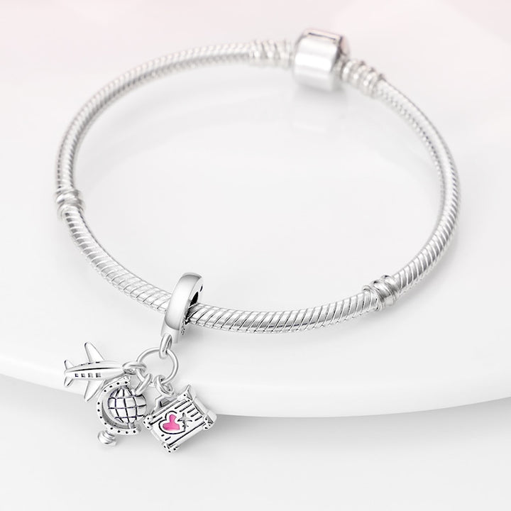 El charm está cuidadosamente diseñado para resaltar los elementos distintivos de cada símbolo: el avión representa el medio de transporte y el deseo de volar hacia nuevas experiencias, el planeta simboliza el vasto mundo lleno de lugares por descubrir, y la maleta representa la preparación y la emoción de cada viaje. Cada aspecto ha sido meticulosamente elaborado para reflejar la belleza y el significado de estos símbolos, haciendo de este charm una pieza destacada en cualquier colección de accesorios.