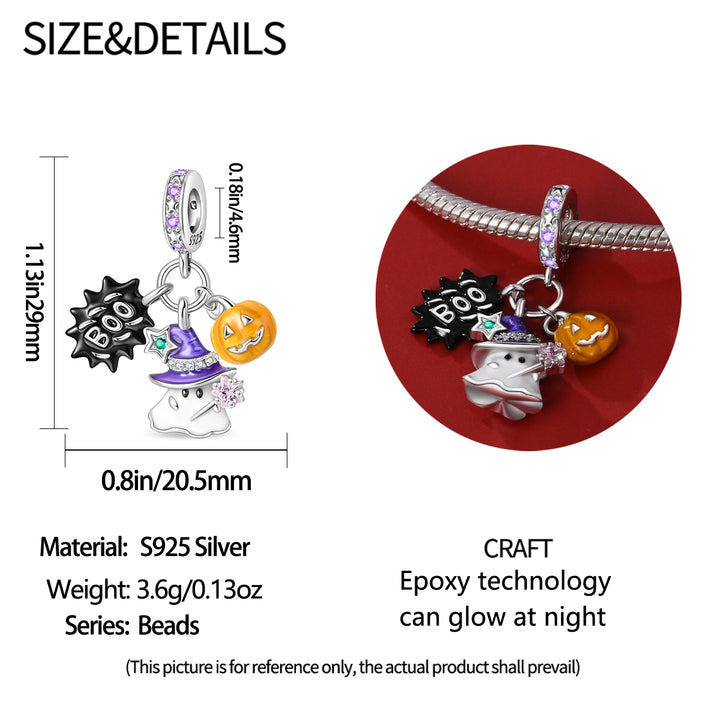 El Charm BOO, Fantasma y Calabaza es una pieza divertida y encantadora que encapsula el espíritu juguetón de Halloween. Este charm combina un fantasma adorable que parece estar flotando, una calabaza sonriente y la palabra "BOO", todo en un diseño colorido y atractivo. Cada elemento está finamente detallado, lo que garantiza un acabado de alta calidad y un estilo único que destaca en cualquier colección.