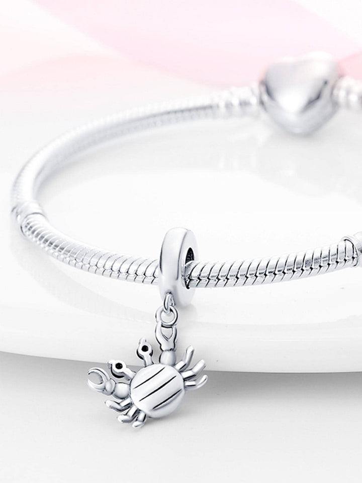 El diseño del charm presenta un cangrejo meticulosamente adornado con pequeñas piedras brillantes que capturan la luz, creando un efecto deslumbrante que evoca el brillo del sol sobre las olas del mar. Cada detalle, desde las tenazas hasta las patas, está finamente elaborado para reflejar la gracia y la majestuosidad de estos fascinantes crustáceos.