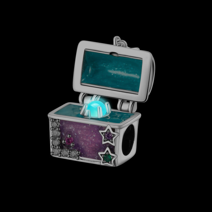 El charm cofre fluorescente es un accesorio de joyería que tiene forma de cofre o caja y está diseñado con un acabado fluorescente, lo que significa que resplandece o brilla bajo luz negra o luz tenue, creando un efecto vibrante y llamativo. Este charm puede estar decorado con detalles intrincados, como piedras brillantes, grabados o colores llamativos que resalten aún más en la oscuridad.