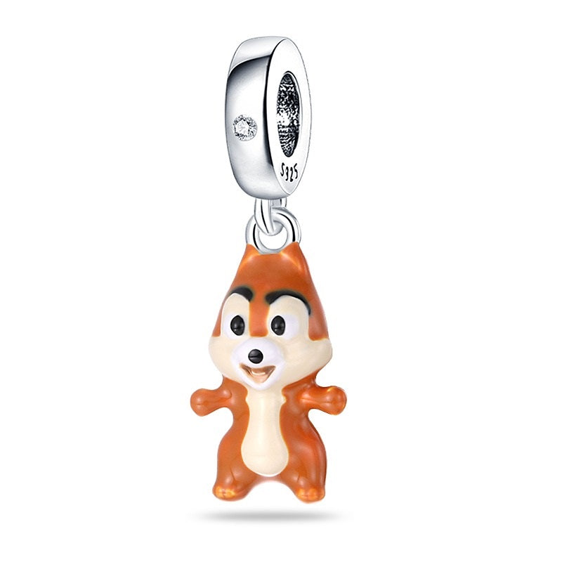Este charm de las ardillas Chip y Dale es una adición divertida y encantadora a cualquier colección de joyería. Hecho de plata esterlina de alta calidad, presenta las dos ardillas en su icónica pose de correr. Los detalles detallados en la cola rayada y las expresiones lúdicas en sus rostros hacen que este charm sea irresistible. Puede ser usado en pulseras, collares o pendientes para agregar un toque de diversión a cualquier atuendo.