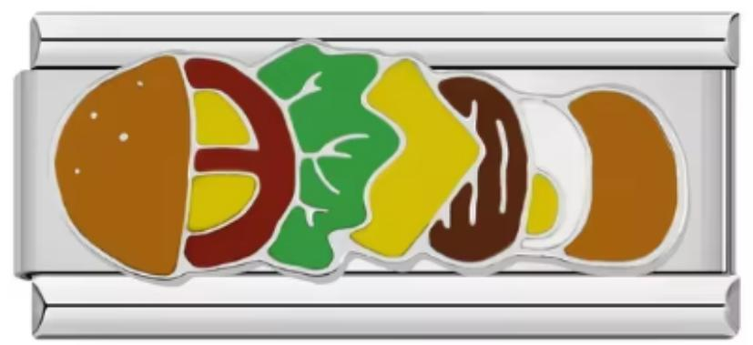 El Charm Italiano Hamburguesa es una divertida y original pieza que rinde homenaje a uno de los platillos más icónicos del mundo. Con su diseño colorido y detallado, este charm es ideal para amantes de la comida, coleccionistas de accesorios únicos o para quienes disfrutan de llevar un toque de humor y estilo en su pulsera.