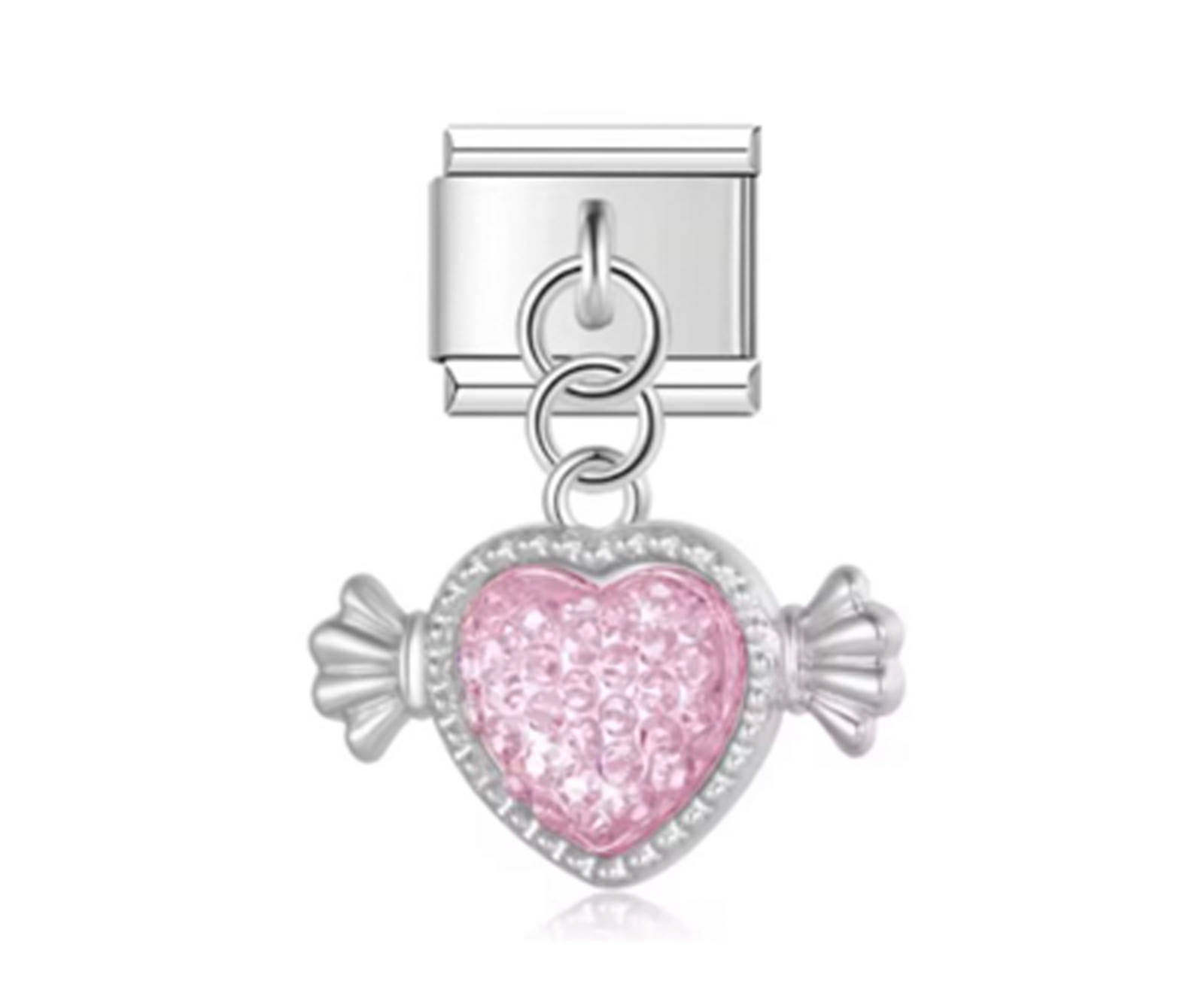 Este encantador charm presenta un corazón rosa con un elegante acabado plateado, simbolizando el amor, la delicadeza y la belleza. Con su diseño suave y su color armonioso, es perfecto para quienes buscan un accesorio que combine ternura y sofisticación, añadiendo un toque de dulzura a su pulsera. 💖✨