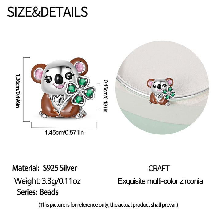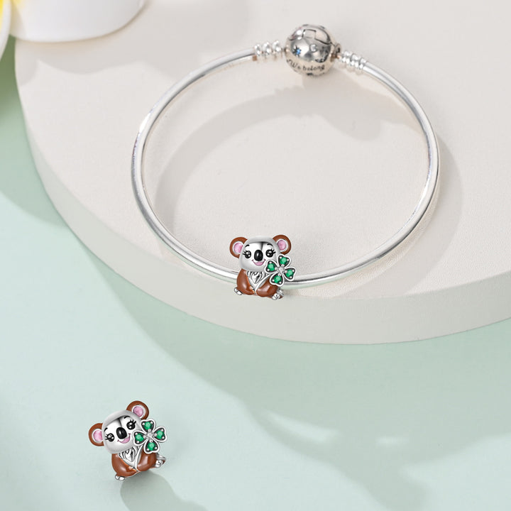 El Charm Koala & Trébol de 4 Hojas es una pieza llena de suerte y ternura. El adorable koala se posa sobre un trébol de cuatro hojas, símbolo de buena fortuna y alegría. Este diseño único fusiona la dulzura de la naturaleza con la magia de la suerte, siendo el accesorio perfecto para quienes buscan añadir un toque de encanto y positividad a su estilo. 🐨🍀✨