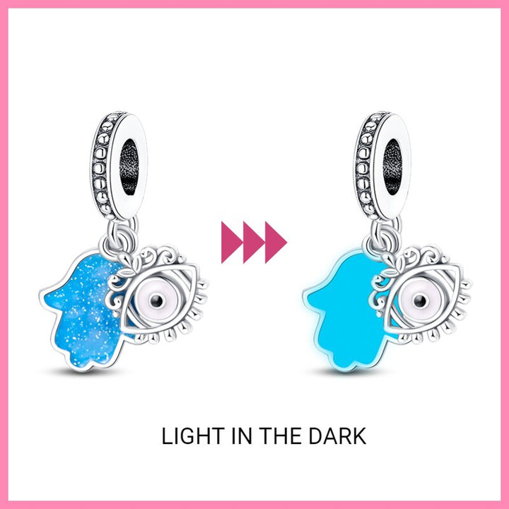 El diseño del charm presenta la icónica Mano de Fátima, también conocida como Jamsa, con su forma distintiva y detalles intrincados. Durante el día, esta mano puede parecer una pieza de joyería exquisita con un significado profundo, pero en la oscuridad, cobra vida con un resplandor suave y mágico. Cada vez que se ilumina, evoca la protección y la energía positiva asociadas con este antiguo símbolo.
