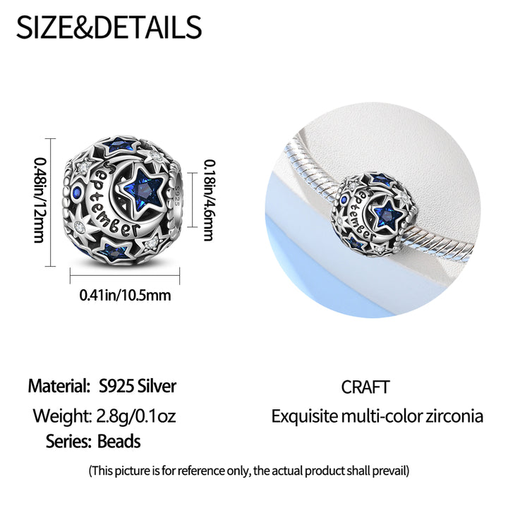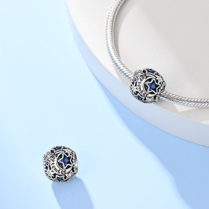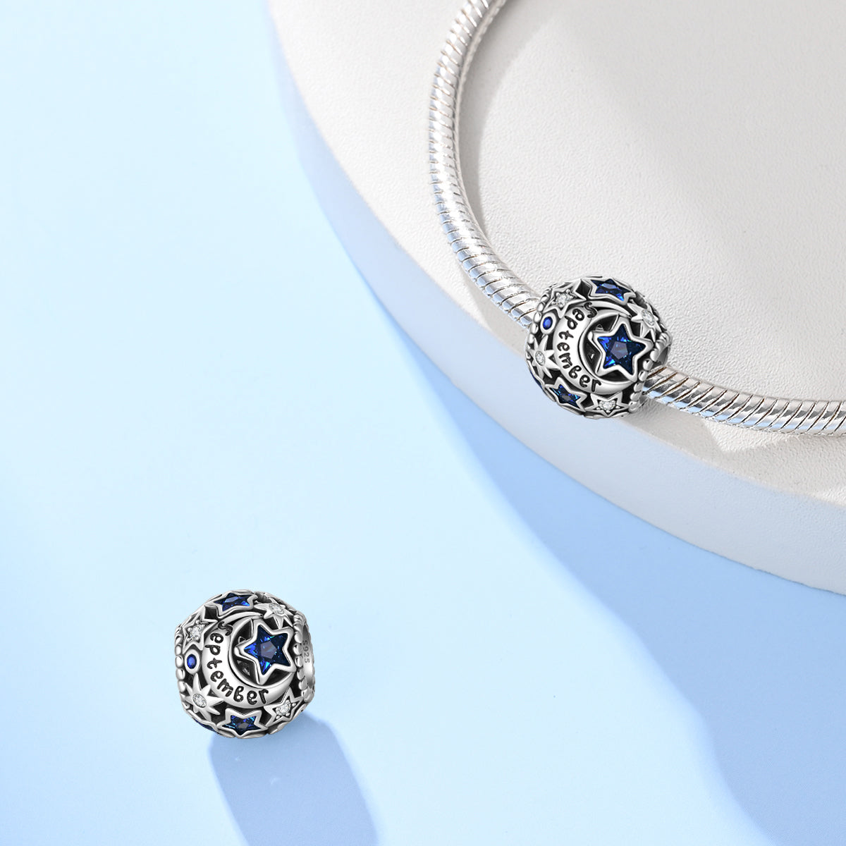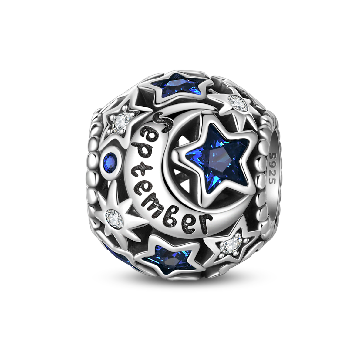 Piedra de nacimiento: La piedra de nacimiento de septiembre es el zafiro, una piedra preciosa conocida por su color azul profundo, que simboliza la sabiduría, lealtad y nobleza. Un charm de septiembre podría tener un zafiro incrustado o detalles de color azul intenso, que evocan la serenidad y la claridad.