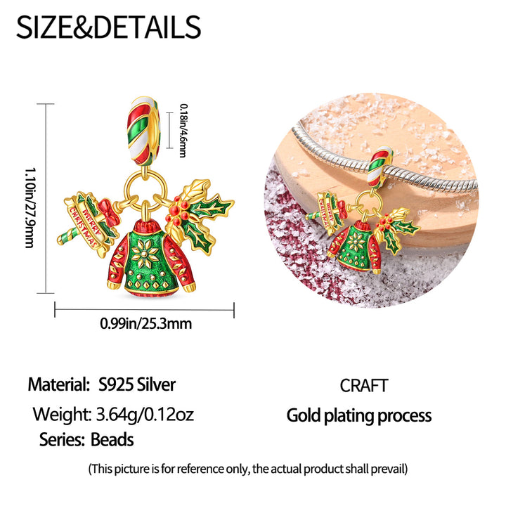 • Esmalte de colores: El suéter se decora con esmalte en colores típicos de Navidad como rojo, verde, blanco y dorado, lo que hace que el charm sea brillante y llamativo.