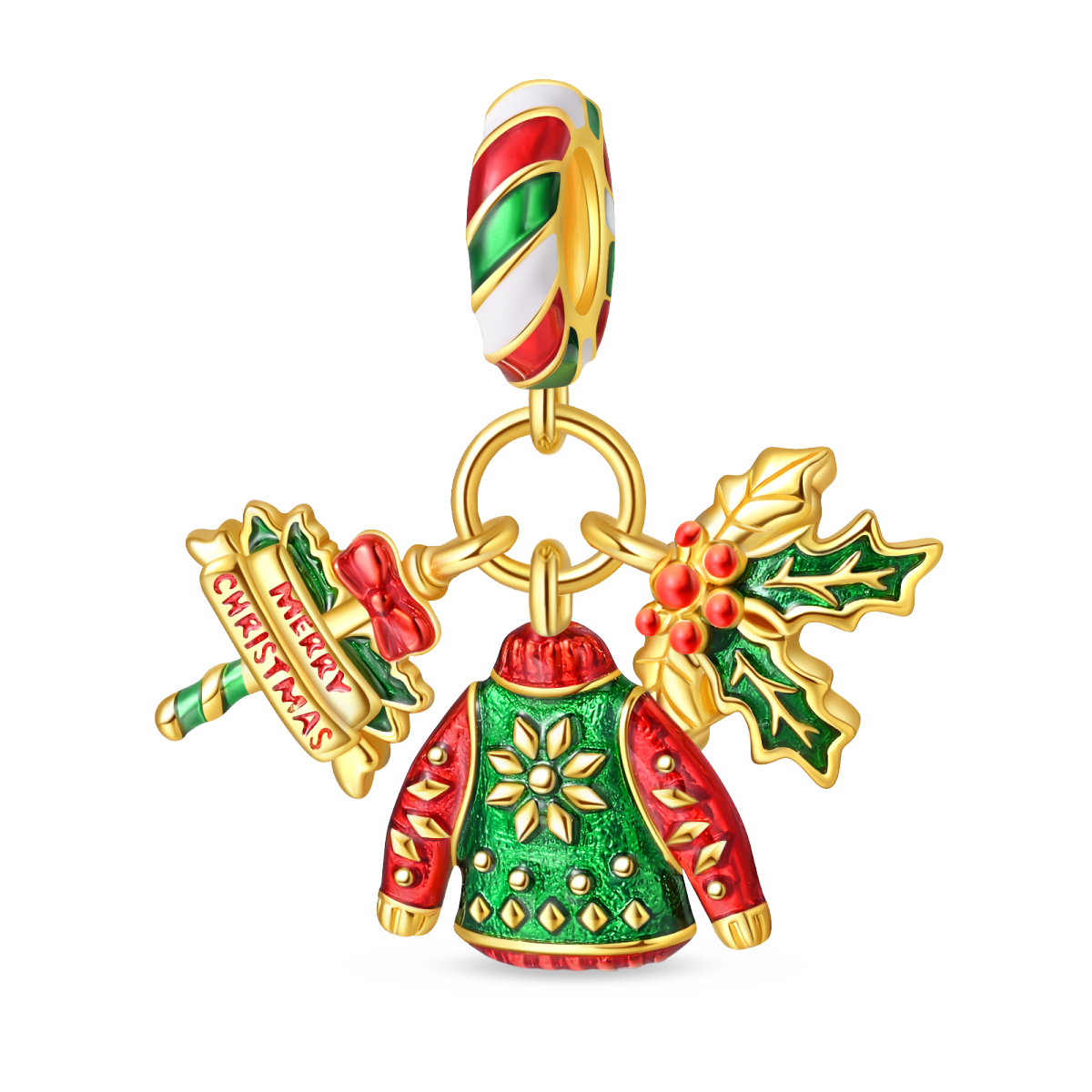 • El charm está diseñado como un pequeño suéter de Navidad con patrones alegres y colores vivos. Este suéter tiene detalles como copos de nieve, árboles de Navidad, regalos, o incluso un reno.