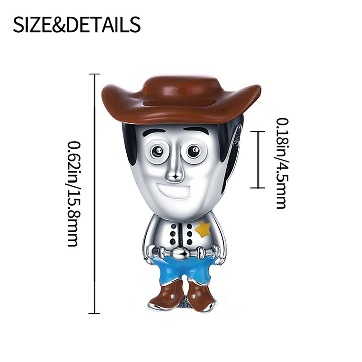 El diseño del charm Woody presenta una figura detallada de Woody, con su característico sombrero de vaquero, chaleco de vaquero, camisa a cuadros y estrella de sheriff. Cada detalle, desde su expresión amigable hasta su postura confiada, está cuidadosamente elaborado para reflejar su personalidad encantadora y su apariencia reconocible. Este amuleto no solo es una adición atractiva a cualquier colección de joyas, sino también un símbolo de la amistad y la aventura.
