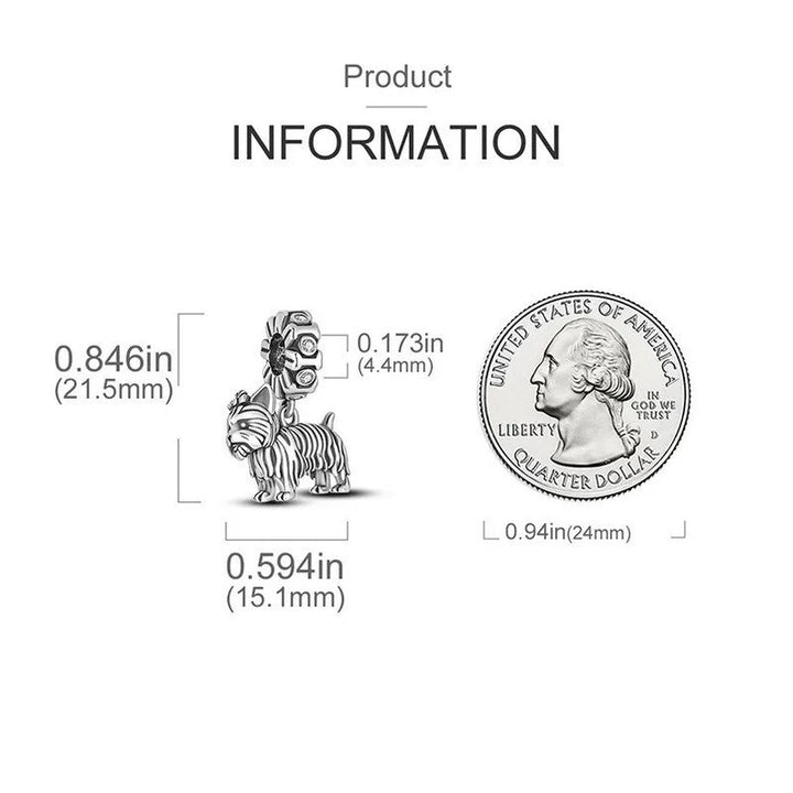 Llévalo como un tributo a tu propio compañero canino Yorkshire Terrier, o como un homenaje a tu amor por esta raza única. Ya sea que lo añadas a tu pulsera como una expresión de tu afecto por los perros Yorkshire Terrier o lo regales a un amigo amante de los caninos como un símbolo de su devoción por sus mascotas, nuestro Charm "Yorkshire Terrier" es una elección encantadora y significativa que cautivará a cualquier amante de los perros.
