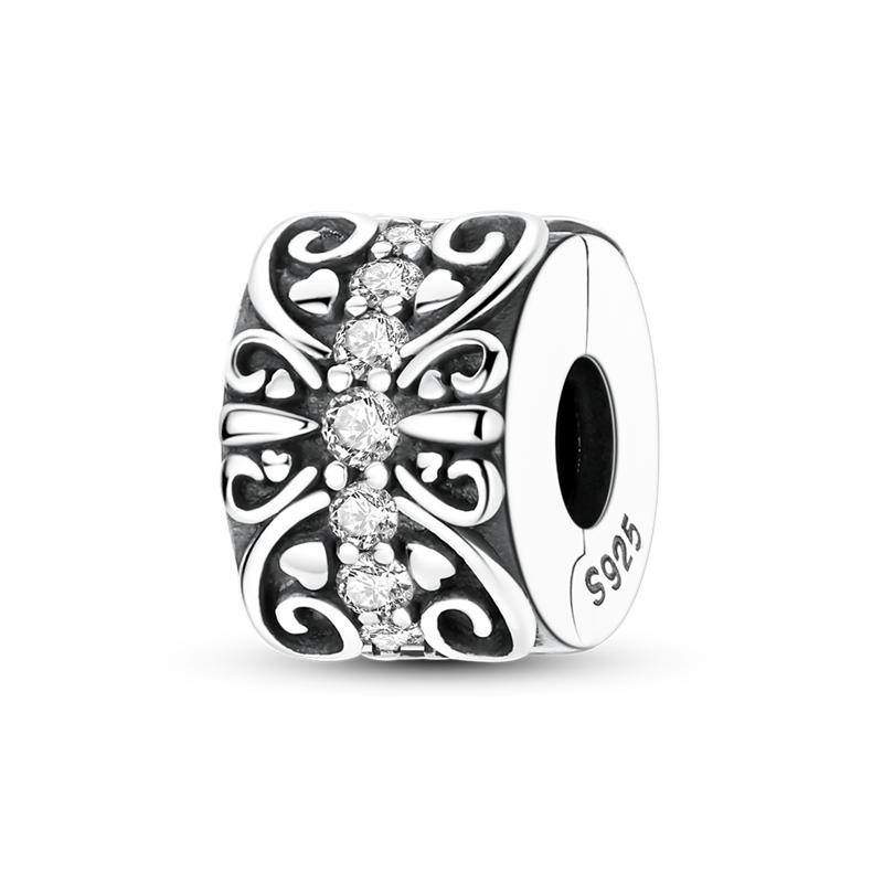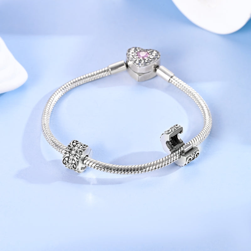 Los clips son accesorios diseñados para distribuir equitativamente los charms en una pulsera, manteniendo un equilibrio visual y funcional. Por su parte, las cadenas de seguridad evitan que los charms se caigan si la pulsera llega a abrirse accidentalmente.